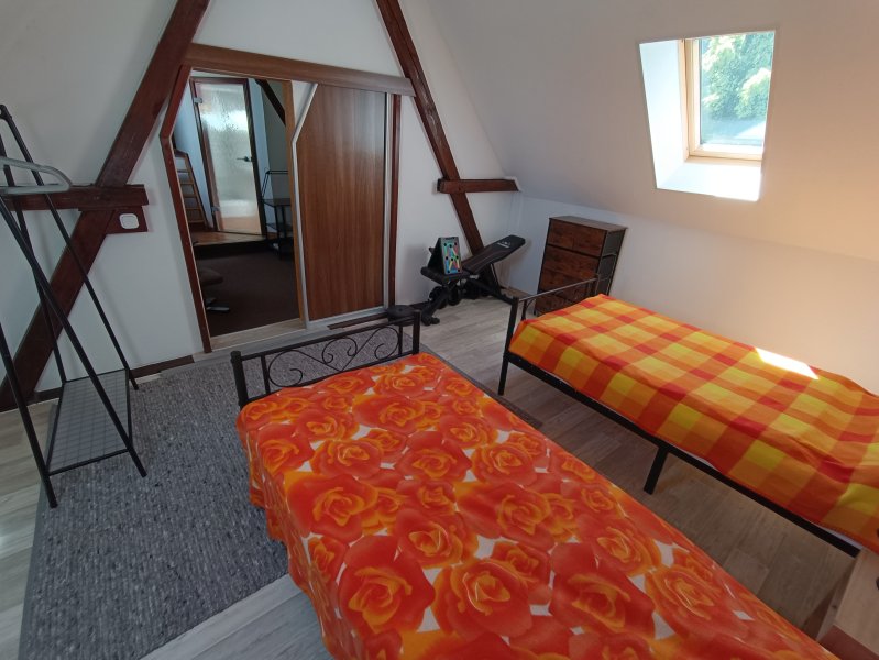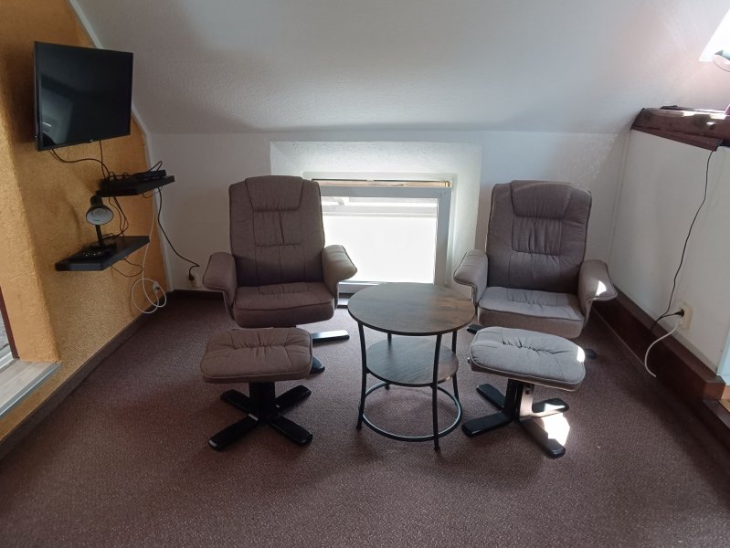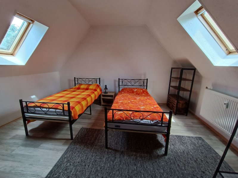 Der durch eine Schiebetür abgeschlossene Schlafraum grenzt ebenfalls an den Wohnraum. Er ist mit 2 Betten, Regal, kleiner Kommode und einer Sportgeräteecke ausgestattet! Im Obergeschoss sorgen Dachschrägen und teilweise Sichtbalken für Gemütlichkeit.