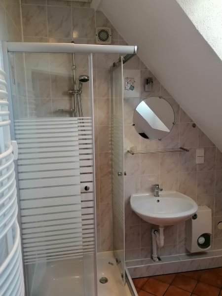 1.OG: Wendeltreppe zur Wohngalerie im 1.OG. * Über ein paar Stufen gelangt man zu den Einbauschränken unter der Dachschräge. Hier ist viel Platz für Ihre persönlichen Dinge und zusätzlicher Stauraum vorhanden. * Von der zentralen Wohnebene aus betritt man ein helles, freundliches Badezimmer. Dieses ist gefliest und mit einer Dusche, elektronischem Durchlauferhitzer, WC und Waschbecken und Badmöbeln ausgestattet. * Anschluss für Waschmaschine vorhanden! Es sind ein Arbeitsbereich und ein Freizeitbereich eingerichtet!