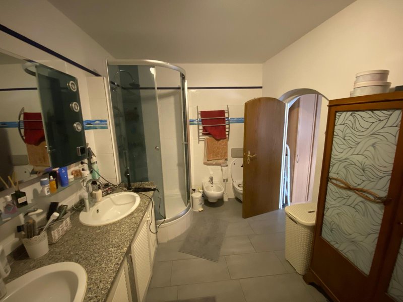 Im Anschluss gelangt man in ein großes Badezimmer mit Badewanne, Dusche, 2 Waschbecken mit darunter liegenden Schränken, WC und BD