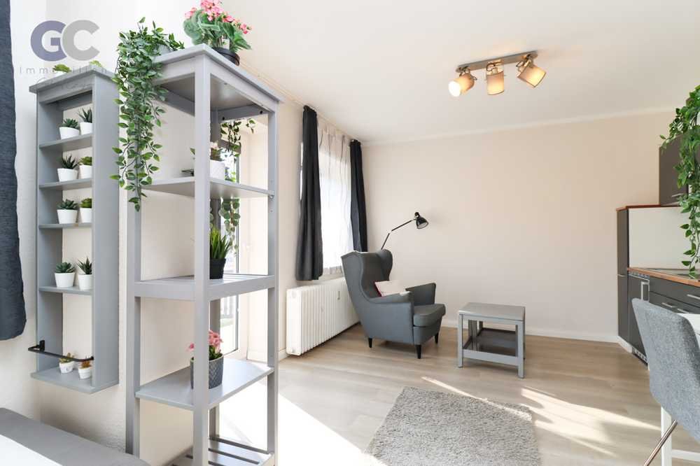 Das Apartment ist vollständig möbliert und umfasst einen Wohn-Schlafbereich mit Bett einem Wand- und Stehregal sowie eine Küche, die mit allen notwendigen Geräten und Utensilien ausgestattet ist, um sofort einziehen zu können. In der Arbeitsecke steht ein Schreibtisch mit Stuhl und weiteren Wandregalen am der Wand. Im Küchenbereich befindet sich ein Sessel und ein kleiner Hockertisch. Die Möbel sind modern und funktional.
