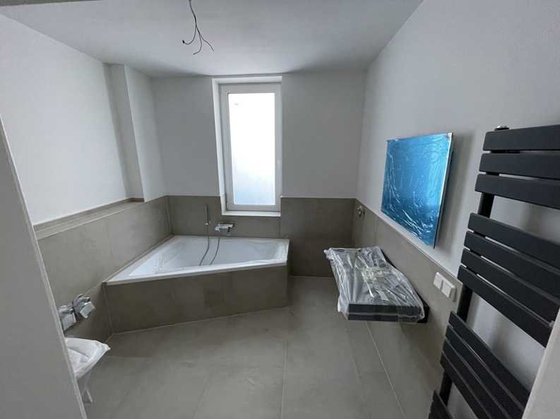 Luxusbad: Ebenerdige Raindrop-Dusche, eine moderne Badewanne und großformatige Fliesen (120x60 cm) sorgen für elegantes Design.
