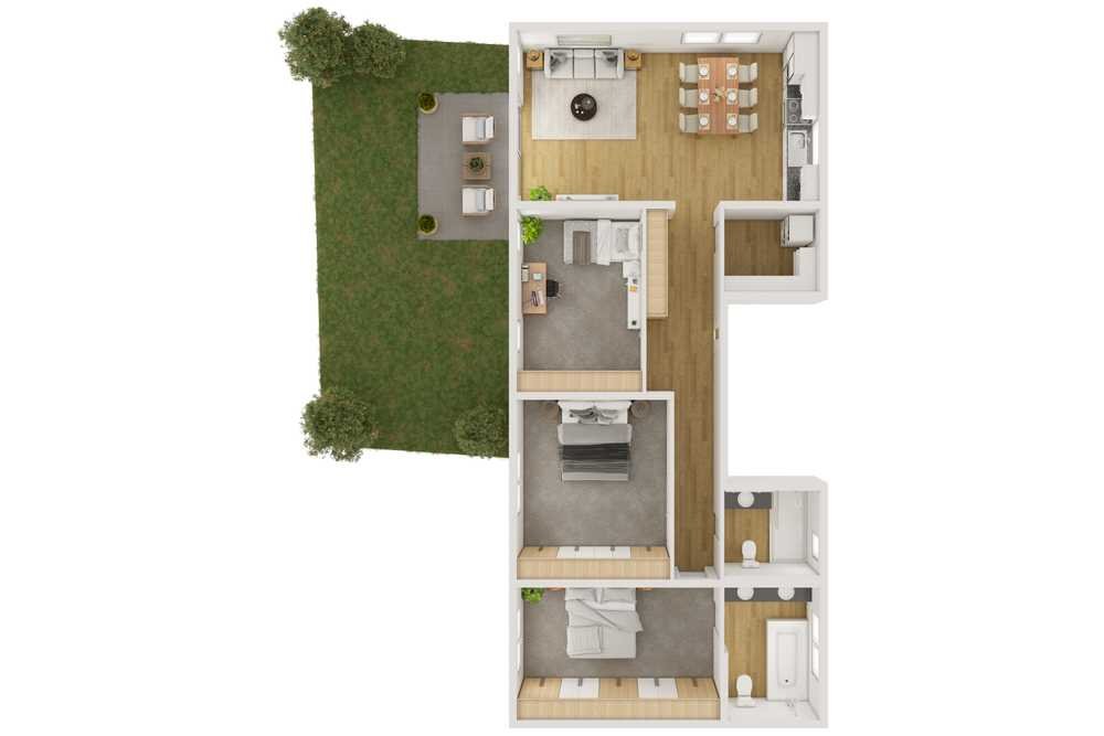 Die Wohnung verfügt über drei weitere Zimmer, die sich flexibel als Schlaf-, Kinder- oder Homeoffice-Zimmer nutzen lassen. Ein stilvoll ausgestattetes Badezimmer mit Doppelwaschbecken und Badewanne sorgt für Komfort im Alltag. Zusätzlich steht ein Gäste-WC mit Dusche zur Verfügung.