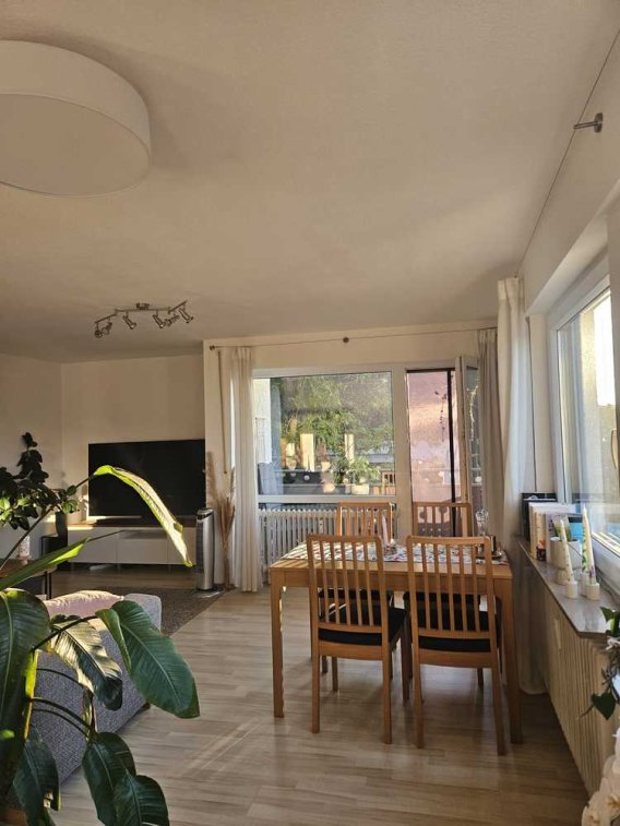 - Großzügiges Wohnzimmer mit gemütlichem Sofa, Esstisch und Zugang zum sonnigen Balkon