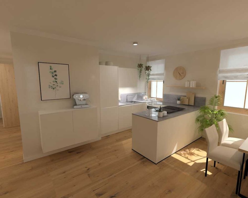 Der großzügige Wohn- Essbereich öffnet sich zum sonnigen Südbalkon und lädt mit Alpenpanorama zum Verweilen ein. Eine Einbauküche kann optional für zusätzlich 100€/ Monat bereit gestellt werden.