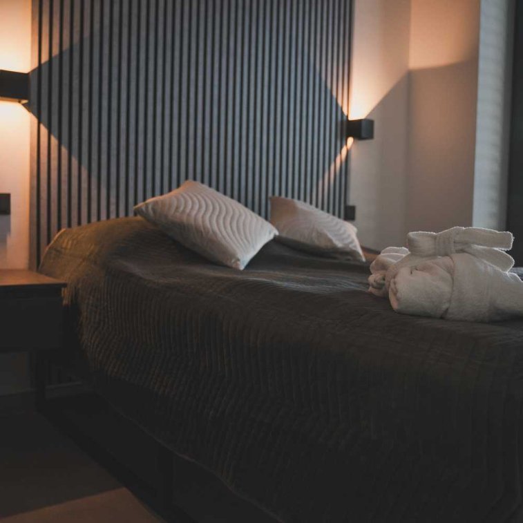 Second bedroom with Bruno box-spring bed, dresser in matching design, built-in wardrobe, and TV.