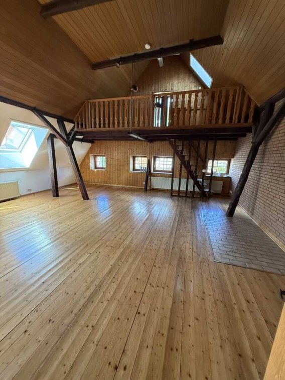 Das Obergeschoss überzeugt mit einem großzügigen Wannenbad, einem weiteren Schlafzimmer, einer offenen Galerie und einem außergewöhnlichen Wohnzimmer, das im ehemaligen Heuboden entstanden ist. Die hohen Decken verleihen dem Raum eine beeindruckende Weite, während die Galerie einen besonderen Rückzugsort mit herrlichem Ausblick über das Dorf bietet. Zur Wohnung gehören außerdem ein Garten mit Terrasse sowie ein separater Abstellraum.