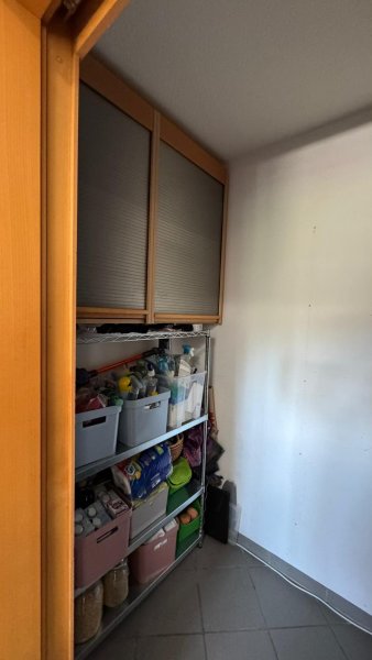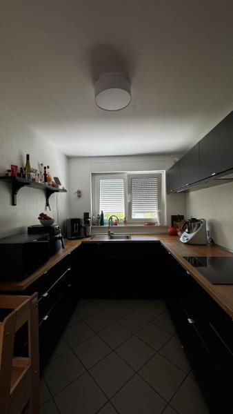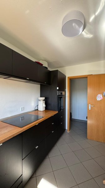 Die Küche ist vom Wohnzimmer durch eine Türe getrennt. Die vorhandene Einbauküche mit Elektrogeräten kann vom Vormieter (1.500 €) abgelöst werden. Ein Vorratsraum mit Schiebetür grenzt idealerweise an die Küche.