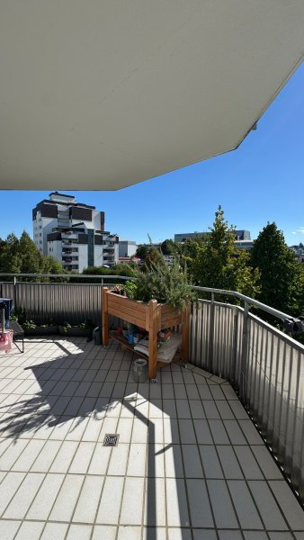Überdachter, großer Sonnenbalkon mit schöner Aussicht.
