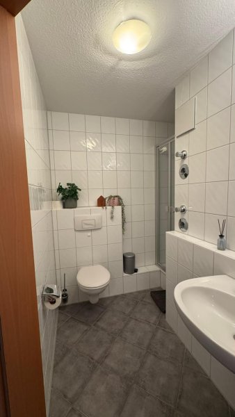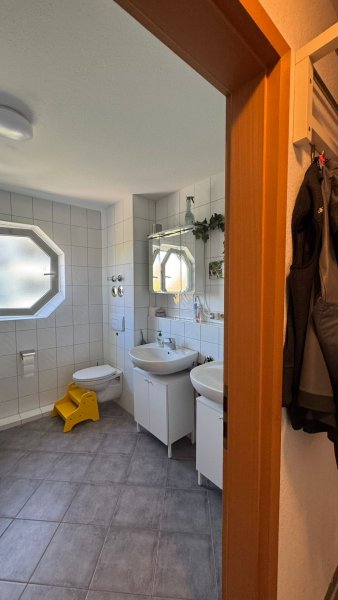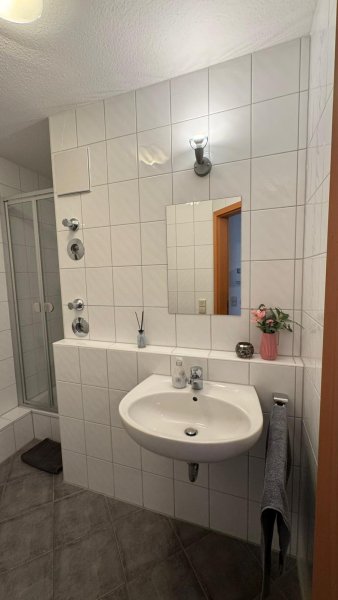 Vom Flur aus erreicht man gleich 2 Badezimmer. Das Gästebad ist mit einer Duschkabine, WC und Waschbecken