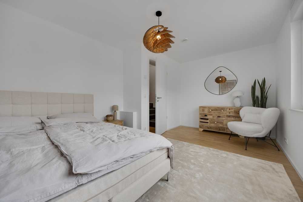 Im Obergeschoss erwarten Sie zwei komfortable Schlafzimmer sowie ein stilvolles Tageslichtbad mit Badewanne, bodengleicher Dusche und Anschluss für Waschmaschine und Trockner – bestens geeignet für Familien.