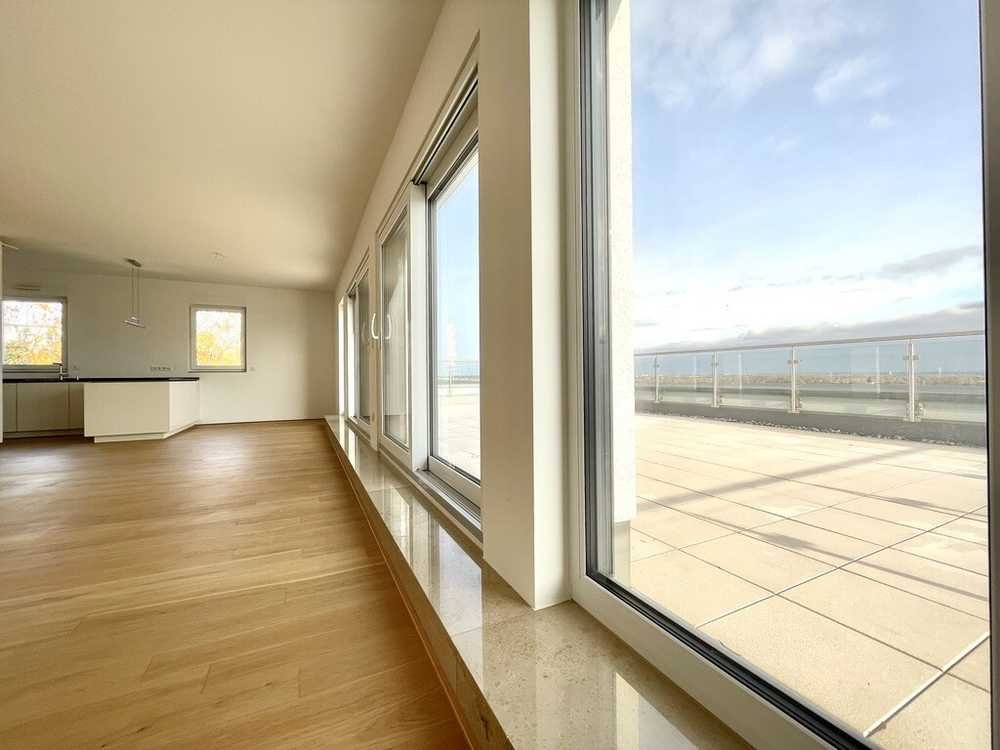 Der offene Wohn-/Essbereich mit Fensterfront über die komplette Breite bietet Zugang zur großen Terrasse (ca 60qm) hat Süd-West-Ausrichtung, einen atemberaubenden Fernblick, und immer die Chance auf Sonne - modernen Edelstahlgeländer & Glaselemente sorgen für Licht und Weite.