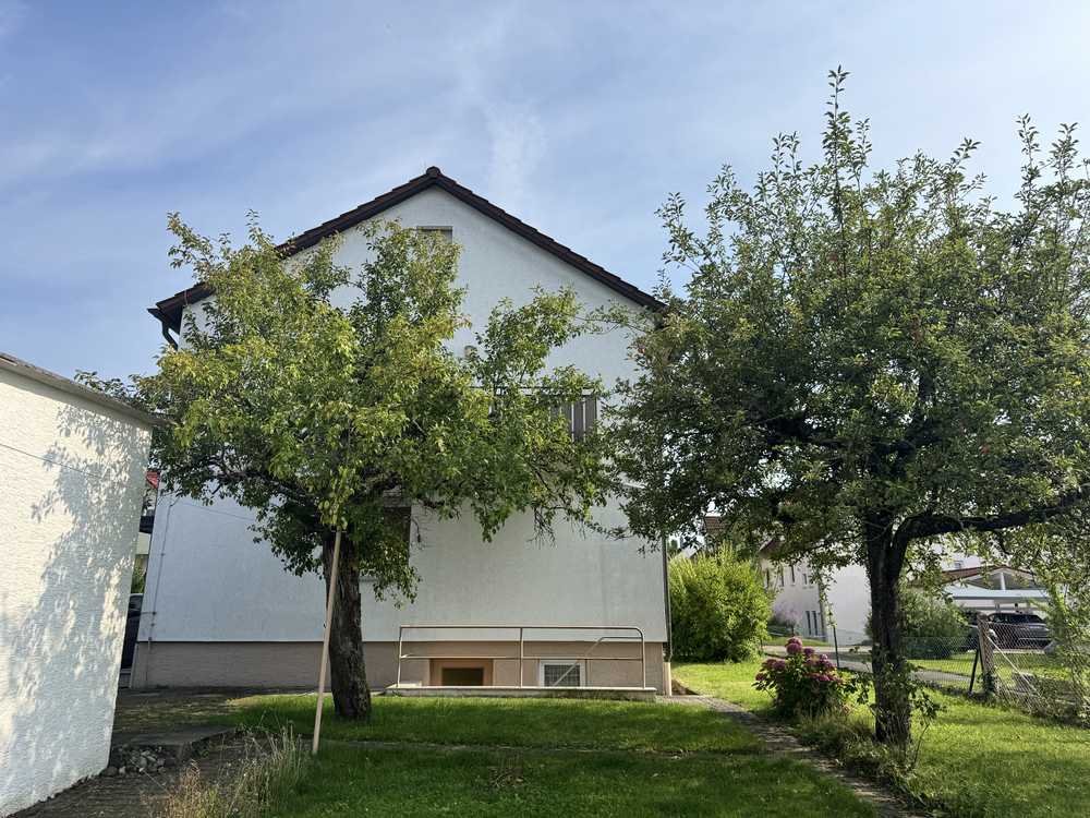 Geräumige 4-Zimmer-Wohnung im 1. Stock eines Zweifamilienhauses. Breiter Flur mit Platz für Garderobe, Gäste-WC und Tageslichtbad mit Wanne und Dusche. Einbauküche führt in den Essbereich. Helles Schlafzimmer und Wohnbereich mit Echtholz-Parkett. Balkon mit Blick in den Garten.
