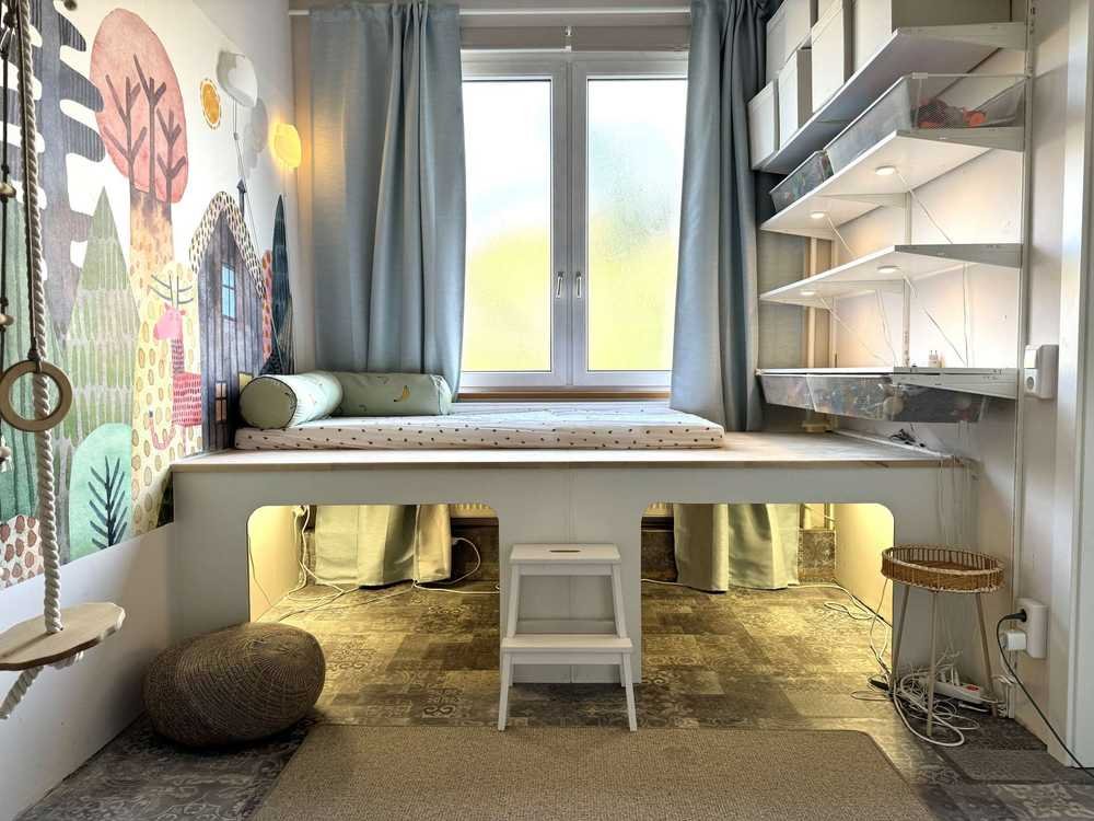 Das Zimmer über viel Stauraum, Bett, Schrank, Kommode, Einbauregale und vieles mehr.