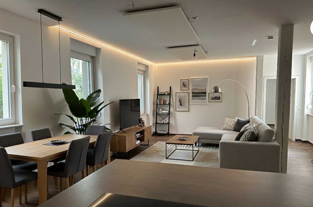 Der großzügig geschnittene Wohn- und Essbereich schafft ein offenes Raumgefühl und wird durch eine stilvolle Küche mit Kochhalbinsel ergänzt. Ein geräumiges Schlafzimmer sorgt für zusätzlichen Komfort. Die Wohnung ist ideal geeignet für Alleinwohnende oder Paare, die urbanes Flair mit einem entspannten Zuhause verbinden möchten.