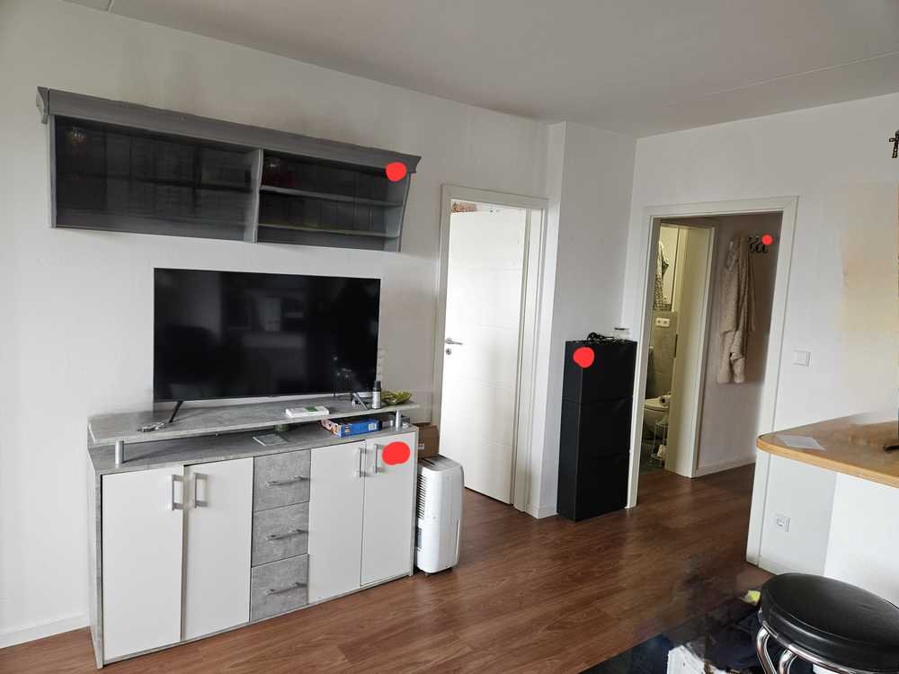 Die Wohnung ist ausgestattet mit vielen Regalen und Schränken, Bett mit 1 Jahr alter neuen Mattatze welche nicht oft benutzt worden ist, Schreibtisch, Küche mit Kühlschrank+ Spühmaschine+ Ofen, Barhocker und einen frisch renoviertem Bad mit Waschmaschine und Dusche.