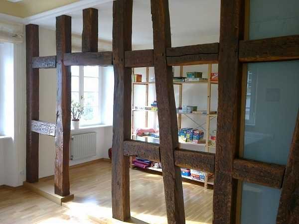 Eine Küche, das große Wohnzimmer mit vielen historischen Fenstern, die Balkenabtrennung zum Schlafbereich und das moderne Badezimmer garantieren ein angenehmes Wohnen.