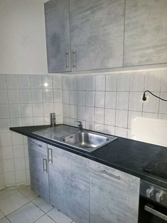 Die Einbauküche in der 2-Zimmer-Wohnung verfügt neben den Küchenmöbeln eine Spülmaschine, Herd mit Kochfeld und Ofen, Tiefkühler, Kühlschrank, eine Dunstabzugshaube und eine Wasserstelle.