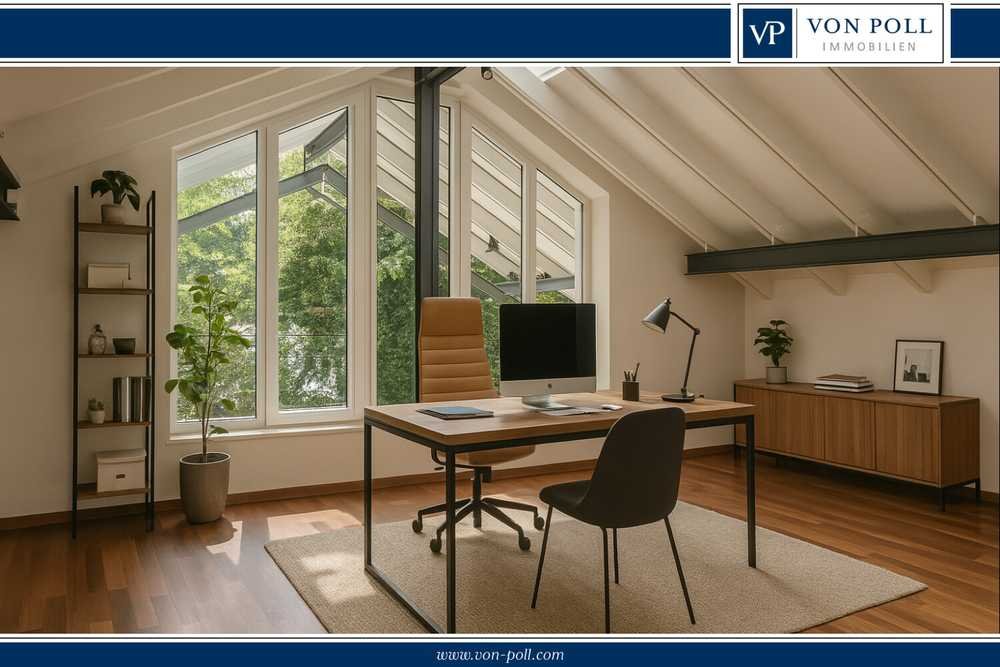 Der 2005 ausgebaute Maisonettebereich bietet einen separaten Zugang vom Hausflur und eignet sich damit perfekt als Homeoffice oder Gästeebene. Neben einem Arbeitszimmer steht hier ein weiteres Zimmer zur Verfügung, das flexibel genutzt werden kann.