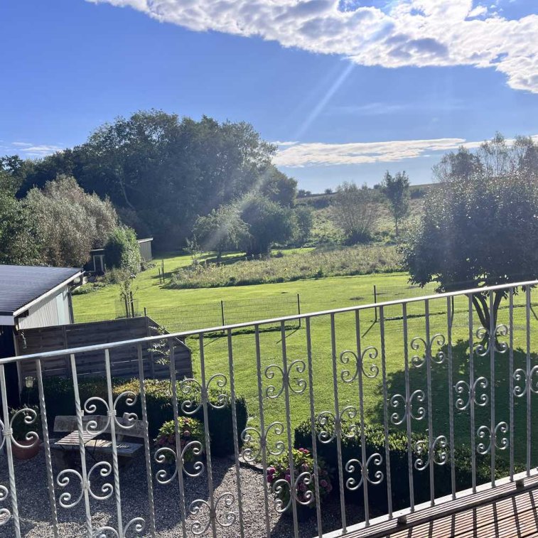 Im Außenbereich sind 2 PKW Stellplätze, ein weiterer Abstellraum und eine Terrasse mit Blick über die Felder und Wiesen vorhanden.