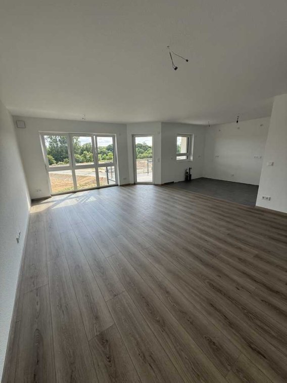 In dem sonnendurchfluteten Wohn- und Esszimmer werden Sie sich wohlfühlen. Raumhohe Fenster öffnen das Wohnzimmer.