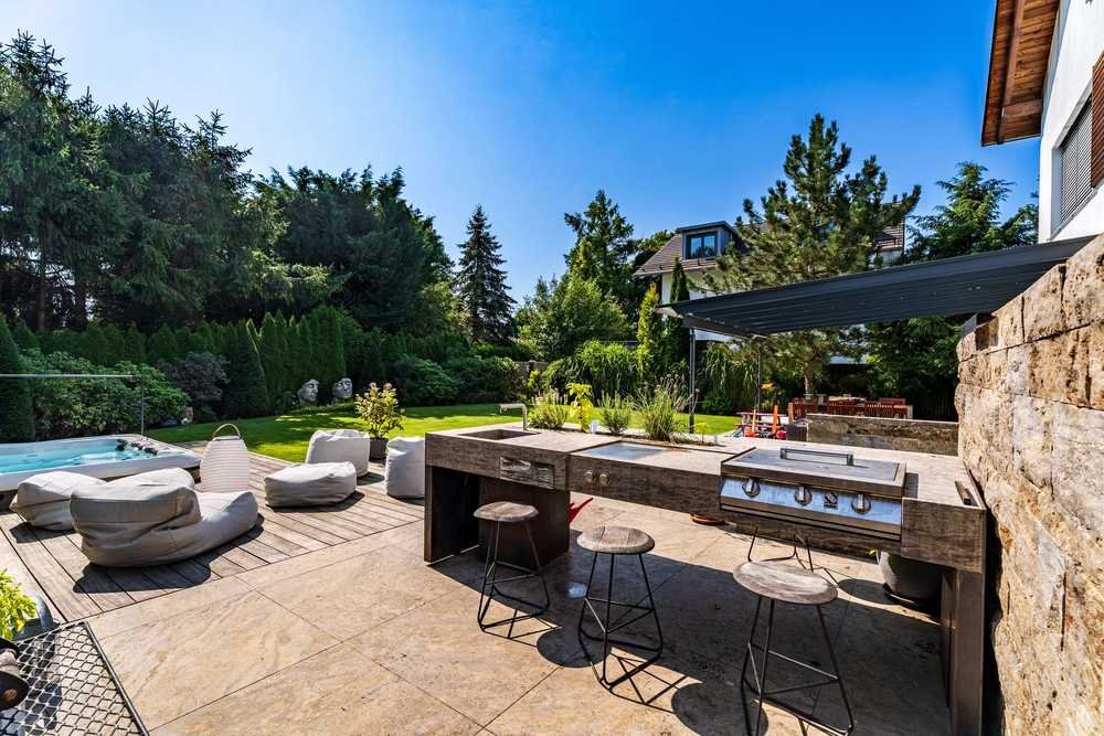 Der Außenbereich besticht durch einen großzügigen, gepflegten Garten mit vielseitigen Freizeitangeboten: Eine Outdoor-Küche lädt zu Grillabenden und geselligen Stunden im Freien ein, während der Whirlpool im Außenbereich für entspannte Momente sorgt. Für Kinder gibt es eine eigene Area im Garten mit Trampolin und sicheren Spielmöglichkeiten.