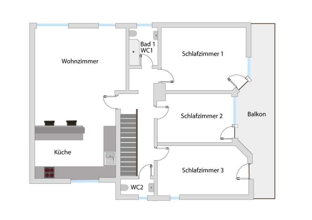 Bereits beim Betreten fällt die freundliche und helle Atmosphäre auf: Die große Wohnküche bildet das Herzstück der Wohnung und bietet viel Platz für gemeinsames Kochen, Essen und Leben. Die drei separaten Zimmer sind vielseitig nutzbar – ob als Schlafzimmer, Kinderzimmer, Homeoffice oder repräsentative Büroräume – und verfügen alle über direkten Zugang zum außergewöhnlich großen Balkon, der zum Verweilen im Freien einlädt.