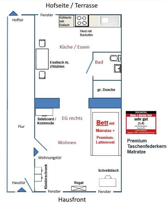 - Wohn-/Arbeitszimmer (ca. 15qm) + eigene Küche/Essen (ca. 13qm) + eigenes Bad (ca. 2,5qm) mit Dusche, WC, neuem Waschtisch, neuen Bad-Möbeln u.v.m.