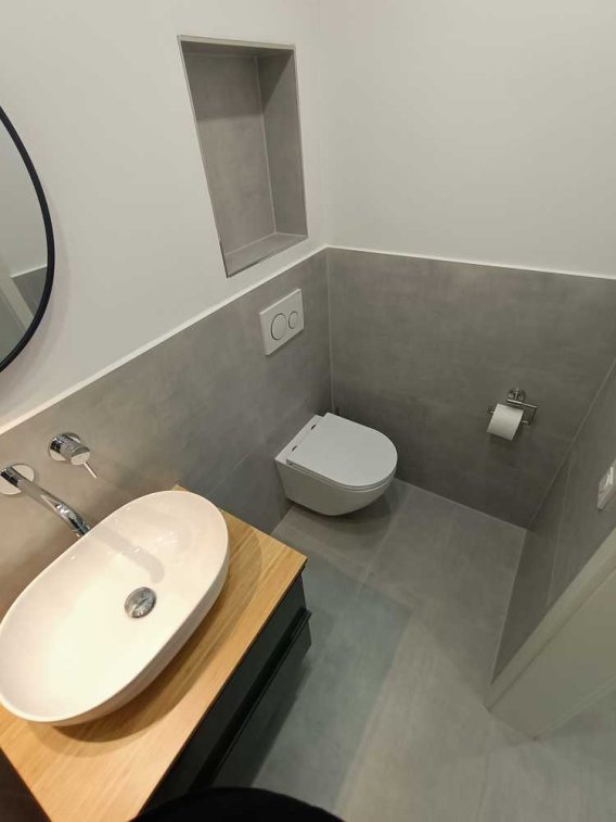 Gäste-WC mit Abluftanlage, Spiegel und Waschtisch