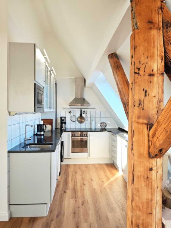 Beim Betreten erwartet Sie ein wunderschönes Wohnzimmer mit freigelegten Balken, einem Essbereich und einer offenen Küche. Das helle Badezimmer mit Tageslichtfenster und Badewanne liegt auf der Rückseite des Gebäudes. Zudem bietet das gemütliche Schlafzimmer direkten Zugang zur praktischen Abstellkammer oder Ankleide.