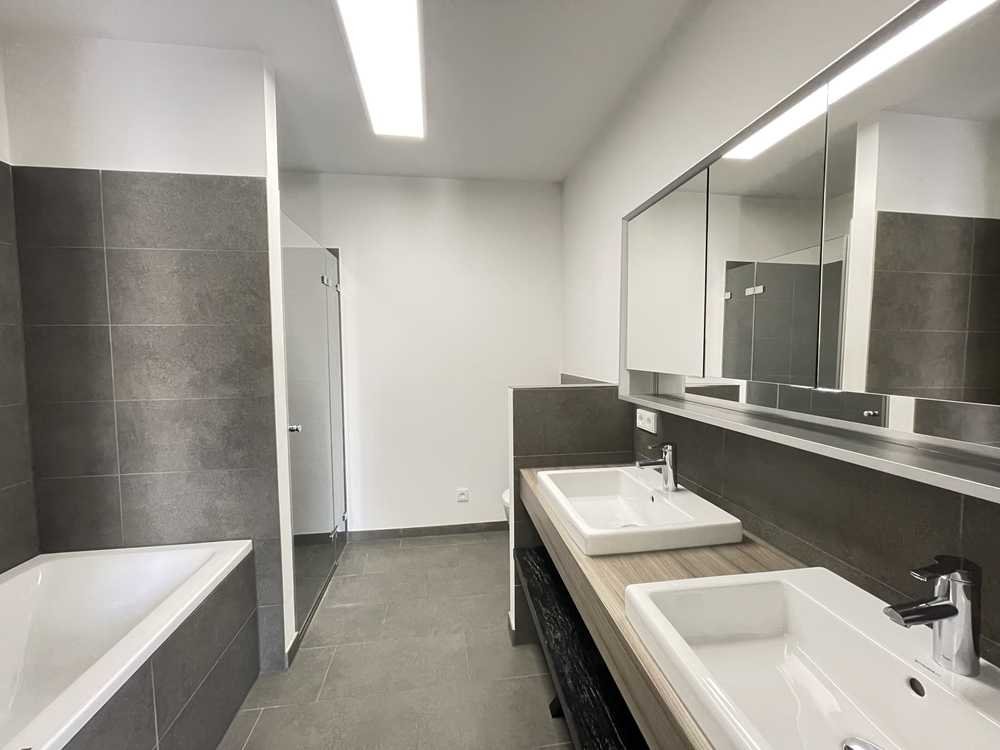 Die Wohnung verfügt über zwei Bäder: ein elegantes Hauptbad mit Wanne, bodengleicher Dusche und Doppelwaschtisch sowie ein praktisches Gäste-WC mit Waschmaschinenanschluss. Ergänzt wird das Raumangebot durch einen separaten Abstellraum innerhalb der Wohnung.
