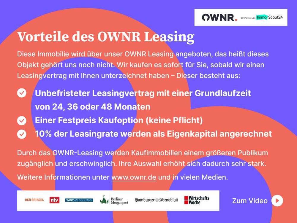 Das Rundum-sorglos-Renovierungspaket ohne eigene Anstrengungen: Alle OWNR-Immobilien werden nach dem OWNR-Standard renoviert. Zur Innenausstattung gehört eine Einbauküche. Zudem sind die Wände weiß gestrichen und die Immobilie wird vor Übergabe gründlich gereinigt. Wir bei OWNR kümmern uns regelmäßig um Renovierungsarbeiten und binden dich gerne in diesen Prozess ein. Wir bemühen uns, Deine Wünsche zu berücksichtigen; bitte beachte, dass dies möglicherweise eine Anpassung der Leasingrate im überschaubaren Rahmen nach sich ziehen kann.