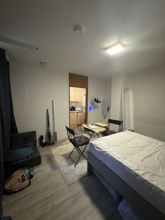 Das Zimmer ist ca. 20m² groß, komplett eingerichtet (Bett, Schreibtisch, Kleiderschrank, Stuhl).