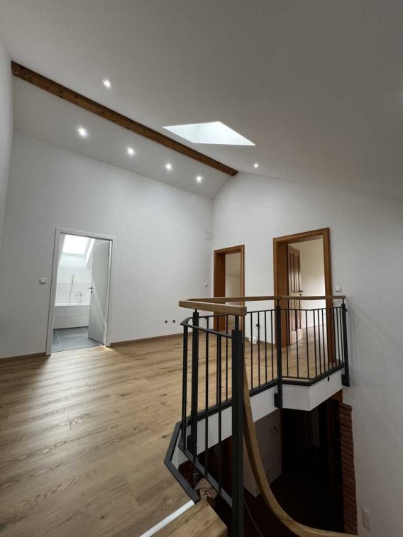 Über eine neue - vom Schreiner hergestellte - Eichentreppe gelangt man in das Obergeschoss, welches in den letzten Jahren komplett ausgebaut wurde. Im Obergeschoss befindet sich ein großzügiges Schlafzimmer mit angrenzendem Speicher, zwei große Kinderzimmer, ein WC sowie ein modern gestaltetes Bad inkl. bodentiefer Dusche, Einbauspiegelschrank, Wandhaartrockner, Wandradio und elektrischen Dachfenstern mit Regensensoren. Die Fenster im Obergeschoss sind alle dreifachverglast.