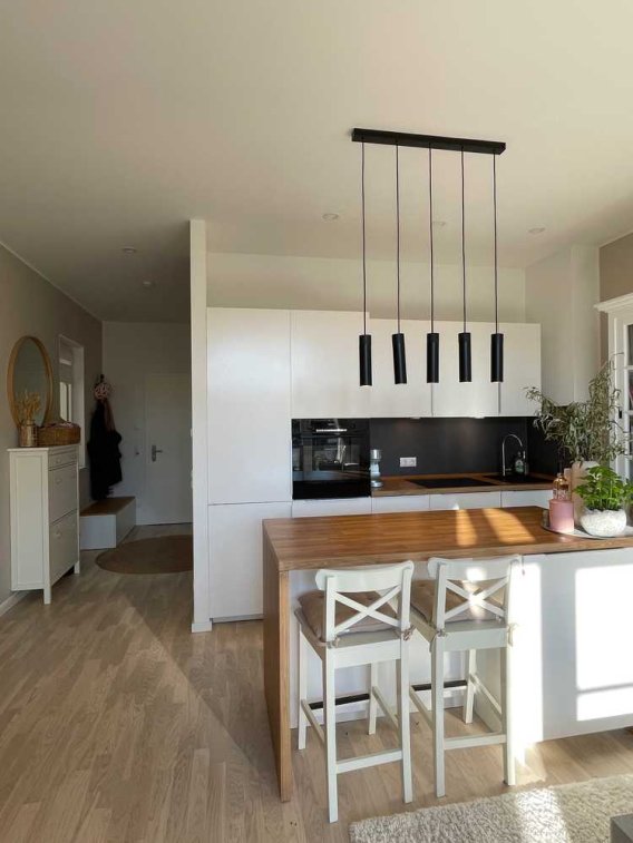 Die knapp 2 Jahre alte Einbauküche (Küchenzeile und -insel, inklusive der Geräte - Ofen, Induktionskochfeld, Geschirrspüler, Kühl-/Gefrierkombi) sowie die elektrischen Vorhänge sollen in der Wohnung bleiben und müssen vom Nachmieter übernommen werden.