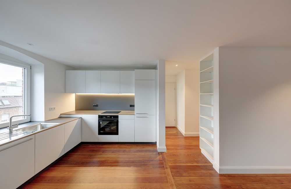 Beim Betreten der ca. 99 m² großen Wohnung im 3. Obergeschoss öffnen sich linker Hand die zwei südlich ausgerichteten Schlafräume mit fachgerecht restauriertem Fischgrätparkett zur ruhigen Rothstraße. Rechts erstreckt sich der Eingangsflur mit raumhohem, maßgefertigtem Garderoben- und Hauswirtschaftsschrank und führt zur Küche sowie zu Gäste-WC und Bad (jeweils mit Fenster). Gehen Sie geradeaus: Dann eröffnet sich der großzügige, nördlich orientierte Wohn-Ess-Bereich (rund 40 m²) mit restauriertem Dielenboden, maßgefertigter Schreiner-Wohnküche und anschließendem, ca. 5 m² großen Wintergarten.