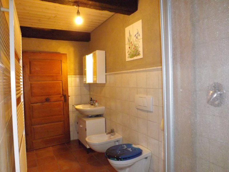1 Badezimmer mit Dusche, BD, WC und Waschbecken,