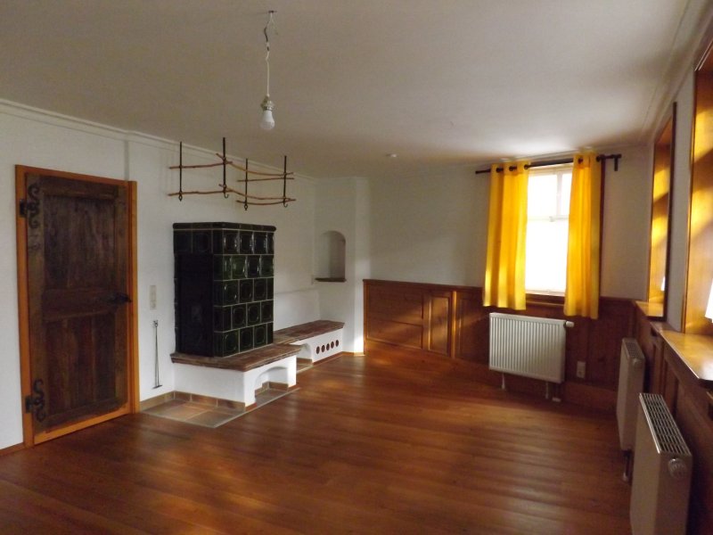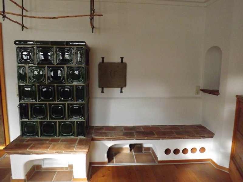 Gästezimmer mit Waschbecken und WC. Historischer Keramikofen (funktional, kann betrieben werden). Großzuggier Flurbereich mit kleinem Lagerraum.