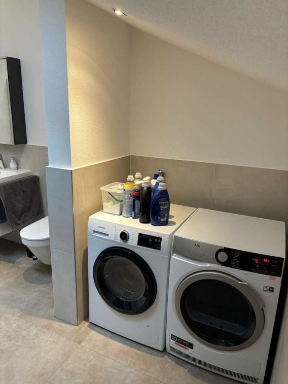 2 geräumige Schlafzimmer (1 mit kleinem Balkon), großzügige Wohnküche mit Zugang zu kleinem Abstellraum/Speis, geräumiges Bad mit Platz f. Waschmaschine, Trockner und Wäscheständer.