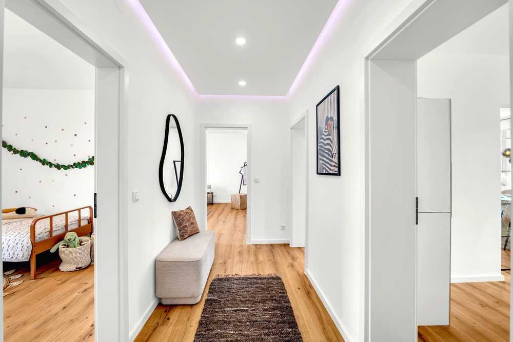 - Decke im Flur inkl. Deckenspots und dimmbarer RGBW Ambientebeleuchtung (Einstellbar per App)