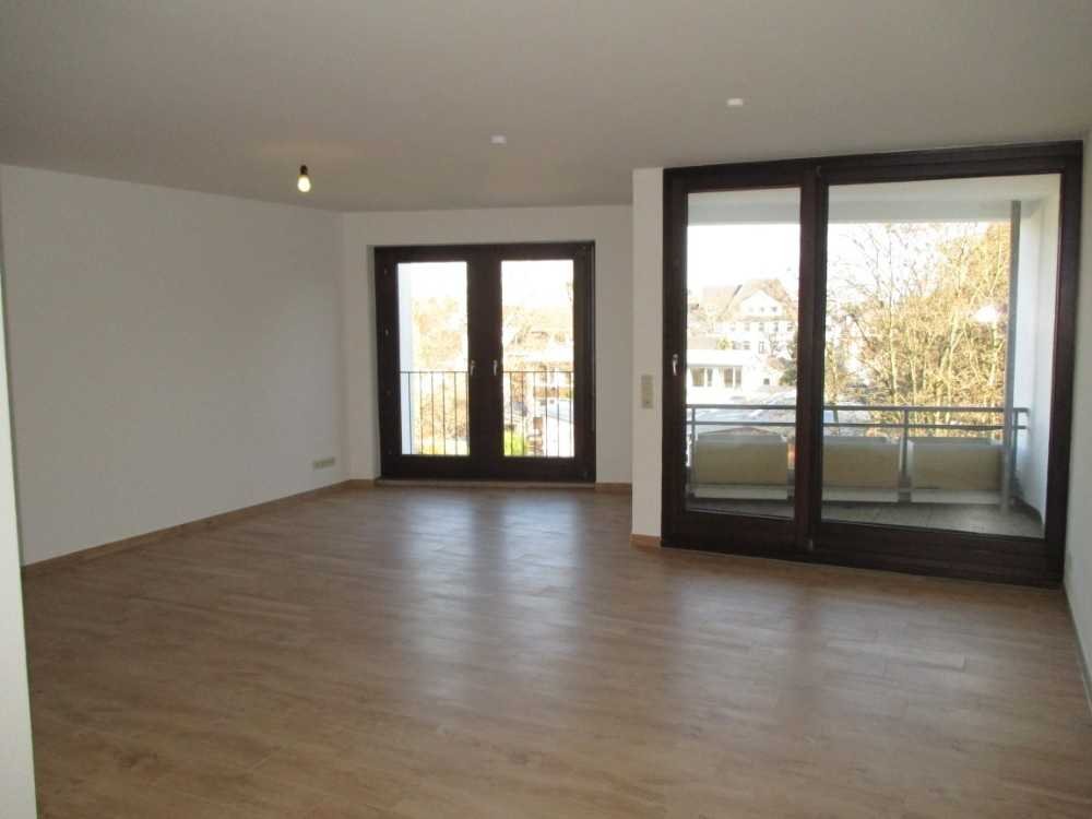 Das großzügige Wohnzimmer ist mit Fliesen in Holzoptik ausgelegt und bietet Zugang zum überdachten Balkon. Der nach Lage des Hauses nach hinten liegende Balkon bietet eine schöne Sicht auf Teile von Kessenich, den Posttower und Langen Eugen sowie das Siebengebirge.