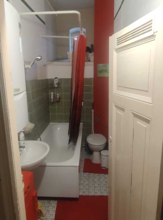 Die Wohnung hat hohe Decken, viel Licht, eine Retro-Küche mit Gasherd, Bad mit Badewanne und einen sonnigen Balkon.