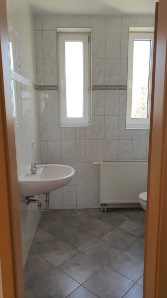 Bad mit 2 Fenstern, Wohnzimmer, Küche, Bad und Flur sind gefliest, Wohnzimmer und Küche mit Fußbodenheizung. Schlafstube mit Laminatfußboden.