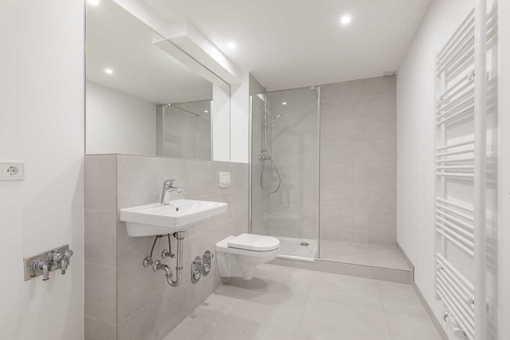 Auch das moderne Badezimmer lässt keine Wünsche offen. Großformatige Fliesen in hellgrau geben dem Badezimmer einen stilvollen Look. Es wurden hochwertige Armaturen von GROHE und Keramik von Villeroy & Boch verbaut. Im Bad ist ebenfalls ein Waschmaschinenanschluss verbaut.