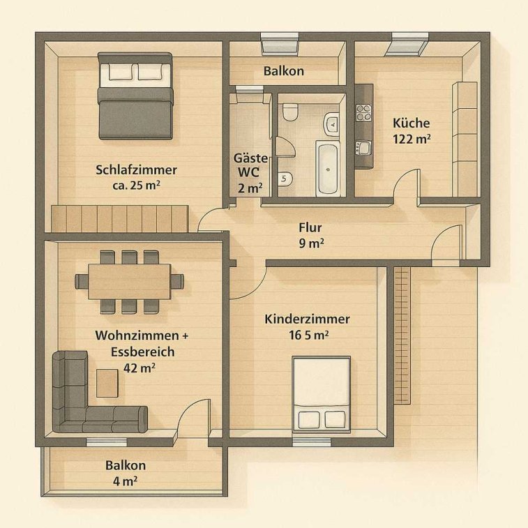 Die Wohnung wurde komplett renoviert – von den Elektrik- und Wasserleitungen bis hin zu Böden, Wänden, Türen und Fenstern ist alles auf neuwertigem Zustand. Das Badezimmer wurde hochwertig gefliest und mit modernen Armaturen ausgestattet. Die Küche bietet genügend Platz für eine Einbauküche und einen kleinen Essbereich.