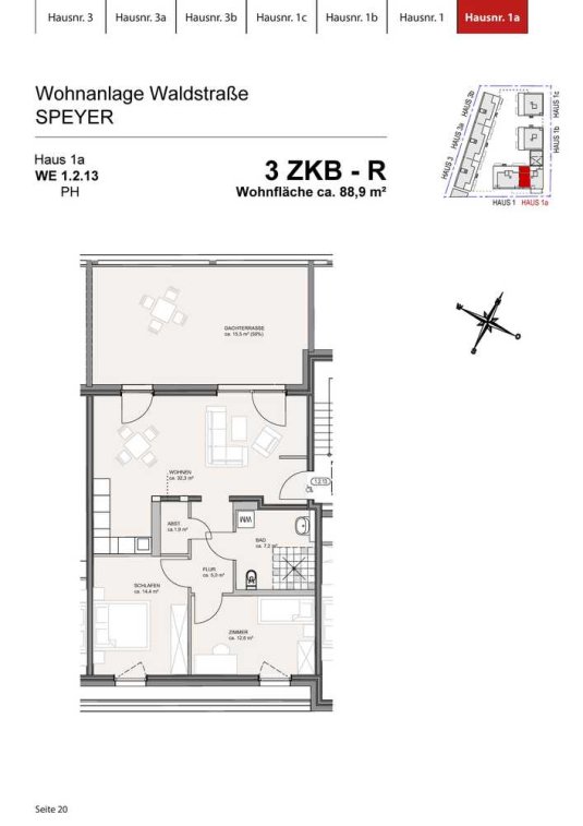 Die 3-Zimmer-Wohnung im Penthouse erstreckt sich über ca. 89 m² Wohnfläche. Sie überzeugt durch den großzügigen Wohn-/Essbereich und eine moderne, optisch abgetrennte Küche. Die Nord-West-Dachterrasse mit Blick auf den begrünten Innenhof ist vom Wohnzimmer aus direkt erreichbar. Zwei geräumige Schlafzimmer, ein modernes Bad mit bodengleicher Dusche sowie ein praktischer Abstellraum runden das Angebot ab.