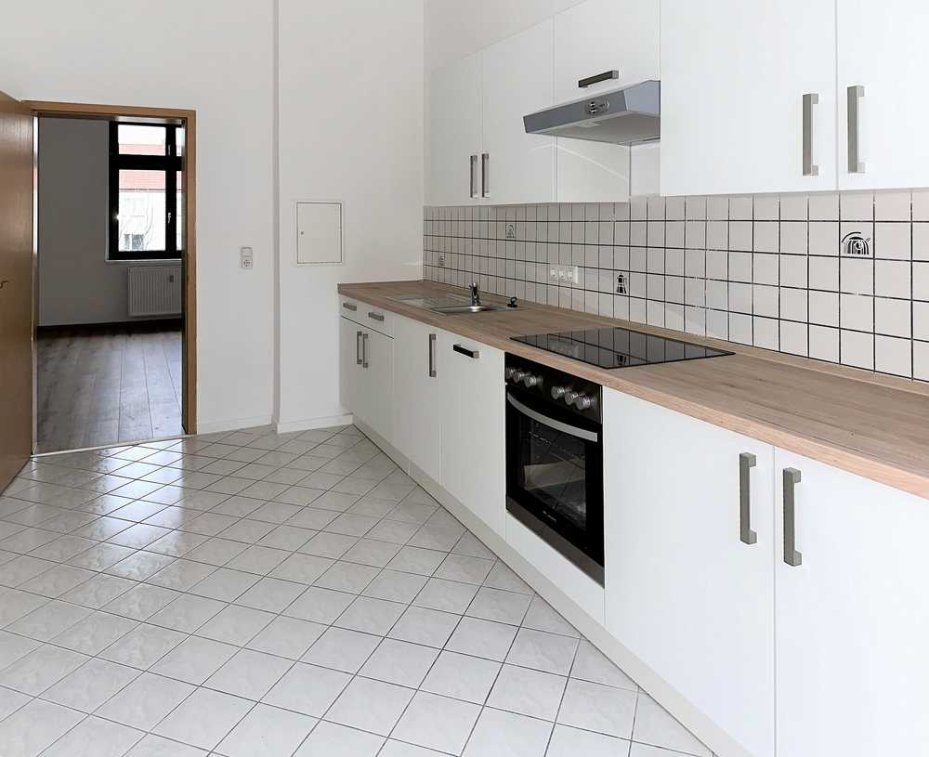 Die große Wohnküche verfügt über eine moderne Einbauküche mit Geschirrspüler, E-Herd, Ceranfeld und viel Stauraum.