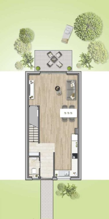 Vom Wohnbereich aus gelangen Sie auf die gepflasterte Terrasse und in den eigenen Garten – ideal zum Entspannen, Spielen oder Gärtnern. Eine stilvolle Sichtschutzwand schafft zusätzliche Privatsphäre. Im Vorgarten befindet sich zudem eine geschlossene, wettergeschützte Box für Mülltonnen und Fahrräder – praktisch und optisch ansprechend.