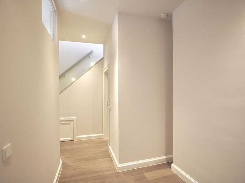 Beim Betreten der Wohnung gelangen Sie zunächst in die Diele des 2. Obergeschosses. Von hier aus erreichen Sie ein Büro, das aufgrund seiner Größe von unter 10 m² als halbes Zimmer angerechnet wird. Ebenfalls auf dieser Ebene befindet sich ein Gäste-Badezimmer mit moderner Dusche. Über eine interne Treppe gelangen Sie in das Dachgeschoss, das den großzügigen Wohn- und Essbereich mit offener Küche bildet. Die hochwertige, neue Einbauküche ist bereits im Mietpreis enthalten und fügt sich harmonisch in den offenen Wohnraum ein.
