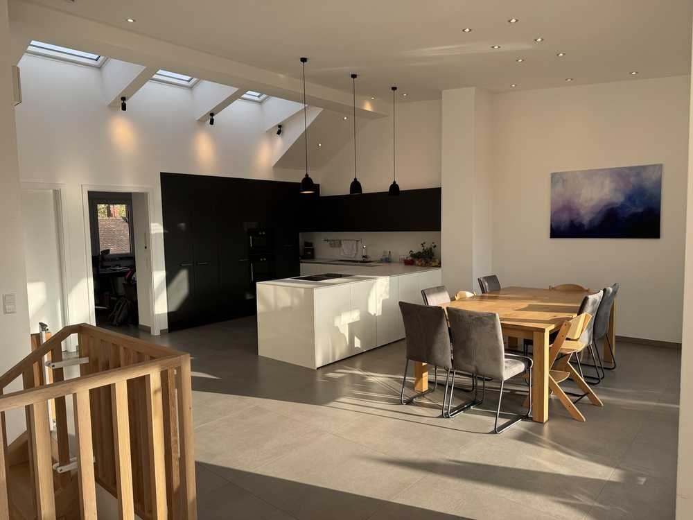 Im 2.OG befindet sich die Schlafetage. Man betritt die Wohnung in einen sehr großzügigen Flur. Direkt angrenzend im Seitenflügel ist das Elternschafzimmer mit Bad und Ankleidezimmer untergebracht. Vorne heraus befinden sich drei weitere Räume mit weiterem Bad. Auch vom Flur abgehend befindet sich ein Haushaltsraum. Direkt am Eingang ist die sehr moderne Eichetreppe verbraut, welche einen in den lichtdurchfluteten Wohnbereich ins 3.OG führt. Oben wird der großzügige Wohnbereich von Ost und West mit Tageslicht versorgt. Die Leicht-Küche bildet den Mittelpunkt des offenen Wohn-/Küchen- und Essbereichs. Die große hälftig überdachte Dachterrasse mit über 40qm vergrößert den Wohnbereich weiter, mit Blick auf den ruhigen Innenblock sowie die ca. 270 Jahre alte Kastanie auf unserem Grundstück. Angrenzend sind 2 weitere Räume (Büro und Gästezimmer) sowie ein WC und eine Abstellkammer untergebracht.