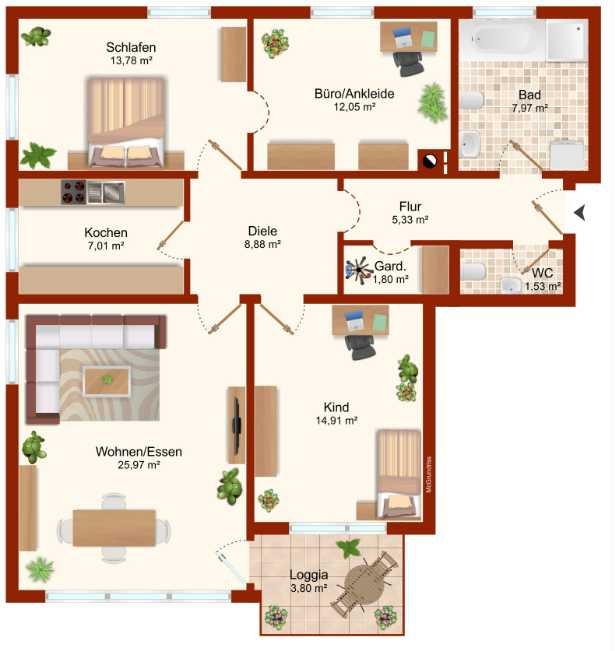 Flur mit einer Nische (Einbauschrank + Platz für die Garderobe) / Gäste-WC / Tageslicht-Bad mit Wanne, Dusche + Waschmaschinenanschluss / Diele / Kinderzimmer / Schlafzimmer mit Zugang zum Ankleideraum+Büro / Küche / Wohn-Esszimmer mit Ausgang zum überdachten Südbalkon